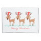 Keep, change or delete the words Merry Christmas. Fun for kids or adults. Features 3 cute, funny, cartoon reindeer or deer with antlers and wearing a festive red Santa Claus hat. The pattern repeats on the back with no wording. A whimsical design for the holidays.