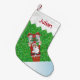 Personalise your Christmas stocking with your child's name! Fun Santa illustration on the front with a glitter green background!