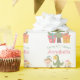 This custom wrapping paper features a cute, pastel winter holiday theme. An image of a whimsical Christmas tree is pictured at the bottom, with two little fairies flying around it. A beautifully wrapped present is pictured beneath each fairy. A sample Christmas greeting and name are printed at the top in a pretty pink and green font.
