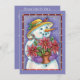 Vintage illustration Merry Christmas holiday design featuring an adorable happy snowwoman in winter. The snowman is smiling and holding a poinsettia flower plant and wearing a hat with holly and a bird sitting on the brim. Fun design for a florist!