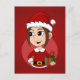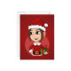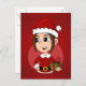 A postcard with an illustration of a cute smiling girl with brown hair, the girl is wearing a Santa Claus costume with a red hat and holding a present. On a red background. With a customisable text template for your name or message.