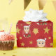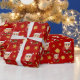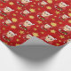Christmas wrapping paper with an illustration of a cute smiling caucasian girl with short blonde hair, the girl is wearing a Santa Claus costume with a red hat and holding a present; in a red circle on a red background,