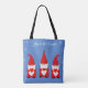 Three Christmas Gnomes and snowflakes on sky blue Tote Bag. Text can be personalised.