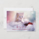 An RSVP card with a photograph of a ginger kitten sitting on a soft white and red Santa hat. Blurry glittering lights bokeh background.