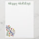 Vintage illustration cartoon Merry Christmas holiday design featuring the word "Holidays" wrapped with colourful yellow, red and green Christmas lights. Surrounded by shining gold stars and a Christmas tree from the forest.
