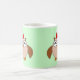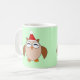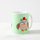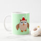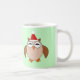 This stylish mug features a funny cartoon of a Christmas owl with sleepy eyes, a small orange beak and cute little orange feet. The owl is brown with a cream belly and is wearing a red and white Santa hat ready for Christmas.