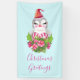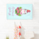 A banner with a cute and whimisical design featuring an adorable penguin wearing a red santa hat. Standing behind a bouquet of flowers with pink and white striped candy canes.