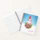 Spiral notebook with a cute and whimisical design featuring an adorable penguin wearing a red santa hat. Standing behind a bouquet of flowers with pink and white striped candy canes. A snowy winter background with snowflakes falling.