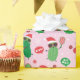 Cute Christmas Pickles with snow, icestars and santa hats playing Pickleball on light pink background