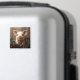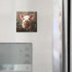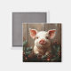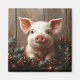 Magnet featuring a digital oil painting of a cute pig surrounded by pine cones and pine tree garland with Christmas lights. The wood background adds a rustic vibe to the artwork.