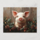 Postcard featuring a digital oil painting of a cute pig surrounded by pine cones and pine tree garland with Christmas lights. The wood background adds a rustic vibe to the artwork.