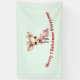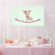 Christmas banner with an illustration of an adorable baby deer. Big eyes big ears with a large head and little brown antlers. Wearing a big red bow. Standing beside a stack of gifts.