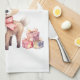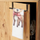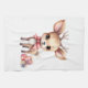 A kitchen towel with an illustration of an adorable baby deer. Big eyes big ears with a large head and little brown antlers. Wearing a big red bow. Standing beside a stack of gifts.