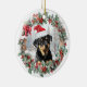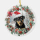 Cute Christmas ornament with a sweet rottweiler dog puppy in a Santa hat in Christmas holly and berry wreath. Personalised dog, puppy, cute animal Christmas ornament (text on the back).