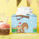Cute Christmas paper featuring a squirrel sitting on a tree limb wearing a Santa hat and holding a Christmas gift.