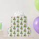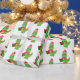 Cute Christmas wrap especially for kids who love dinosaurs! Features pattern of green smiling T-Rex in santa hat and scarf on white background.