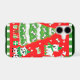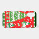 Vintage illustration red and green Christmas holiday design featuring cute fur babies, puppies and dogs wearing sweaters and Santa hats. A decorated Christmas tree has presents underneath. Doggie bones, stars and golden bells decorate this image.