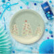 These paper plates feature three Christmas trees with ornaments and stars on top. Background is light green with snow falling.