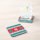 Plastic coaster with red/teal patterned design.