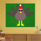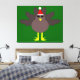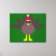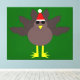 This awesome canvas print features a funny cartoon of a Christmas turkey with big black eyes, a small yellow beak and tail feathers sticking up. The feet are facing in opposite directions making the turkey look clumsy. The turkey is wearing a red and white Santa hat and is ready for Christmas.