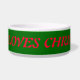 This awesome dog bowl features a funny cartoon of a Christmas turkey with big black eyes, a small yellow beak and tail feathers sticking up. The feet are facing in opposite directions making the turkey look clumsy. The turkey is wearing a red and white Santa hat and is ready for Christmas.The festive red text is customisable allowing you to personalise this dog bowl with the name of your dog.