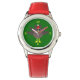 This awesome watch features a funny cartoon of a Christmas turkey with big black eyes, a small yellow beak and tail feathers sticking up. The feet are facing in opposite directions making the turkey look clumsy. The turkey is wearing a red and white Santa hat and is ready for Christmas.