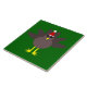 This awesome tile features a funny cartoon of a Christmas turkey with big black eyes, a small yellow beak and tail feathers sticking up. The feet are facing in opposite directions making the turkey look clumsy. The turkey is wearing a red and white Santa hat and is ready for Christmas.