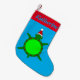 This cute Christmas stocking features a cute Christmas Sea Turtle with a green shell and 4 legs. The turtle is wearing a festive red and white hat. It has cute black and white eyes and a tiny green tail. The outer section of the shell is decorated with alternating holly leaves and berries and pretty red poinsettia flowers. There is custom text at the top so you can include the name of the recipient or a message of your choice.