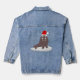 This awesome denim jacket features a graphic image of a cute little Christmas Walrus. The Walrus has brown fur with big black eyes and white tusks. It is sitting on an iceberg in the middle of the ocean and wearing a red and white festive hat.