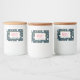 Container labels with a whimsical festive pattern. Polar bears, reindeers, trees. foxes, and snowflakes. On a dark green background.