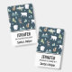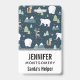 Name badge with a whimsical festive pattern. Polar bears, reindeers, trees. foxes, and snowflakes. On a dark green background.