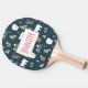 Personalised ping pong paddle with a whimsical festive pattern. Polar bears, reindeers, trees. foxes, and snowflakes. On a dark green background.