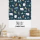 A poster with a whimsical festive pattern. Polar bears, reindeers, trees. foxes, and snowflakes. On a dark green background.
