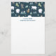 Stationery paper with a whimsical festive pattern. Polar bears, reindeers, trees. foxes, and snowflakes. On a dark green background.