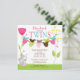 Start your twins baby shower off right with our sweet baby bodysuit clotheslines baby shower invitation for a girl boy twin birth combination. Our multiple baby shower invitation for a girl & boy twin features a cute bunny sitting on a lawn with a pink & yellow flowers with two clotheslines with blue, pink, lime green & brown baby bodysuits. Coordinating brown & lime green polka dots back. Visit our shop for matching thank you note cards, stickers and postage stamps Baby bodysuits are © Erin Bradley Designs