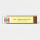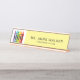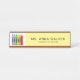 This cute and professional desk name plate for teachers design features colourful, rainbow crayons over a yellow background.
