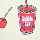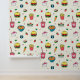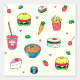 Seamless pattern with cute illustrations of Japanese food and fast food featuring ramen, sushi, burger, fries, bubble tea, cherry and strawberry fruit, cheese cake, with tiny hearts for a bachelorette or birthday party decor, for kid's and teenager bedroom, dorm, kitchen, accent wall in a restaurant, diner, cafe etc. The background is in ivory white.