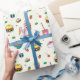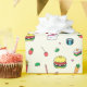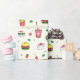 Seamless pattern with cute illustrations of Japanese food and fast food featuring ramen, sushi, burger, fries, bubble tea, cherry and strawberry fruit, cheese cake, with tiny hearts for a kid's and teenager, bachelorette or birthday party decor and gift wrap.