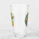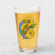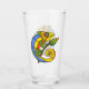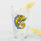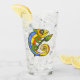 This glass tumbler for beverages has a cute colourful lizard in colours of green, yellow, orange, and blue with big eyes holding a branch with a green and yellow leaf on the front and back.