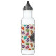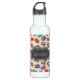 Personalised water bottle with a cute pattern of macarons in many different colours with a faint polka dot pattern behind. A fancy vintage-looking grey and white decorative frame with your name inside.