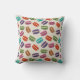 A pillow with a cute pattern of macarons in many different colours with a faint polka dot pattern behind.