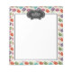 Personalised notepad with a cute pattern of macarons in many different colours with a faint polka dot pattern behind. A white frame in the centre to write inside with a fancy vintage-looking black and white decorative frame at the top with yourpersonalized text inside.