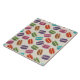 Ceramic tile with a cute pattern of macarons in many different colours with a faint polka dot pattern behind.