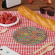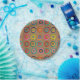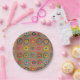 Colourful whimsical playful design of watercolor rainbow circles against a brown neutral background. This cute modern Scandinavian infuenced design is simple and modern.