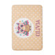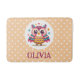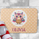 Personalised cute, colourful, whimsical owl bath mat with polka dots on a yellow background.