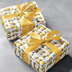 Construction birthday wrapping paper sheets featuring a simple white background, with cute cartoon illustrations of bunting, stop signs, a dump truck, a digger, a wrecking ball crane, and splatters of dirt.