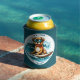 Funny can cooler featuring a cute dog on a surf board. Perfect for a dog lover or surfer. Also nice as a gift for a surf dad for his birthday or Father's Day.