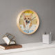 A portrait of an adorable brown and white Corgi Dog is the feature on this clock. The image is placed on a retro, slightly distressed striped sunset background. Dark gold numbers and diamond shaped markers around the perimeter make the clock easy to read. Perfect for anyone who has lost their heart to a loveable Corgi.