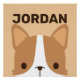 This design features cute little corgi dog cartoon illustration with personalised name in brown modern sans serif font style on light brown background.