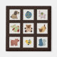 A cute country style quilt with baby animals. Quilt blocks include: gingham dog, blue ladybug, pink elephant, patchwork fish, teddy bear, yellow cat, pink plaid pig, baby chick, and blue squirrel. Printed pattern, not actual material.